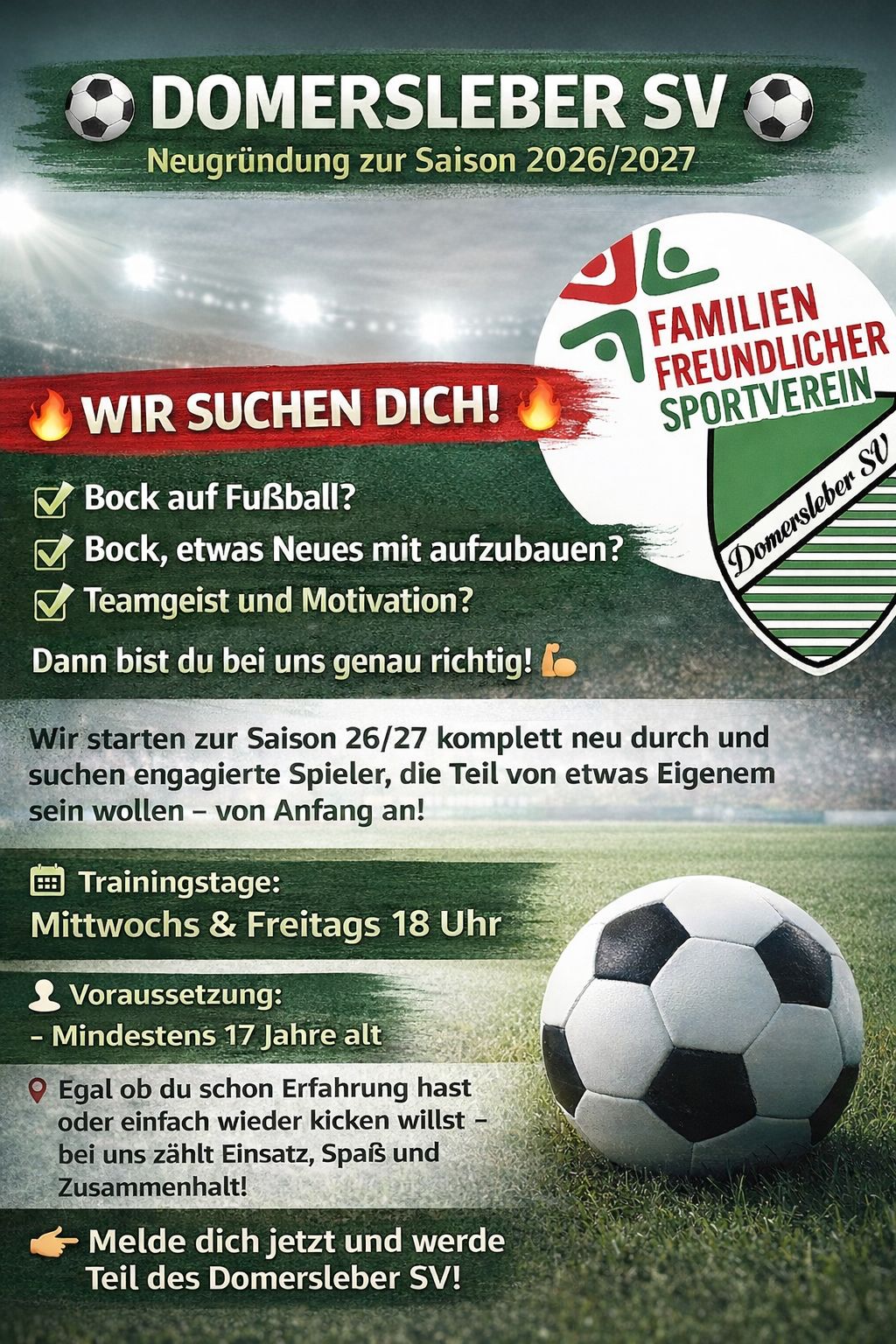 Unser Ziel ist klar: Ab der Saison 2026/27 gehen wir wieder in den regulären Ligaspielbetrieb. Dafür suchen wir motivierte Mitspieler: egal, ob du eine neue sportliche Herausforderung suchst, nach einer Pause zurück auf den Platz willst oder einfach Lust auf Fußball hast.